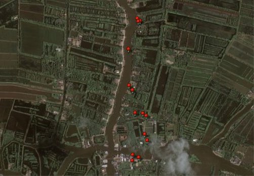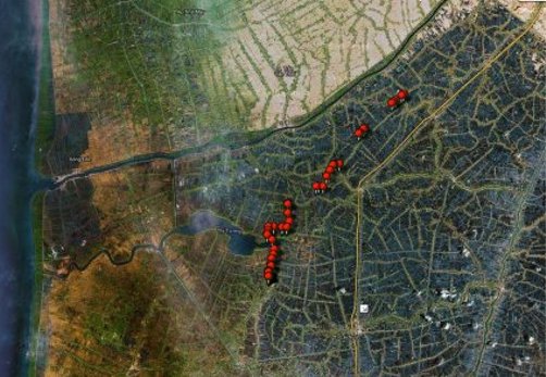 Sur cette carte du sud de Cà Mau, une seule route, en rouge, le reste n’est que voies navigables. Les points rouges dessinent la route suivie pour aller de la mission de Cái-Rắn (point le plus au nord) à Giap Nuoc l’un des points les plus éloignés de la paroisse (environ 20 km) au sud.